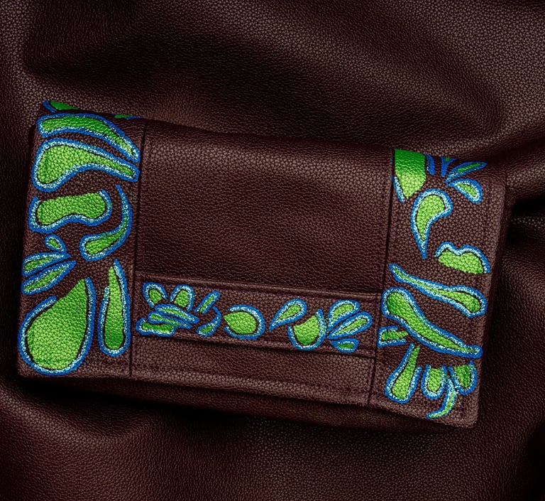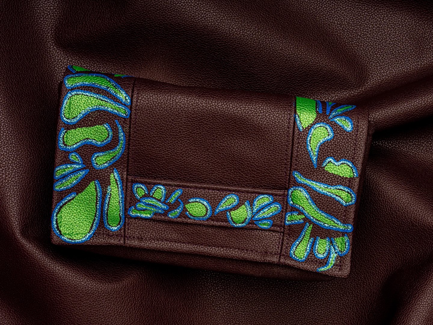 This burgundy handbag is made of faux leather with satin lining inside. Hand-painted on the exterior is a deconstructed hibiscus flower—you've been seeing this motif throughout the collection in the embroidered black stretch velvet. It's all connected.