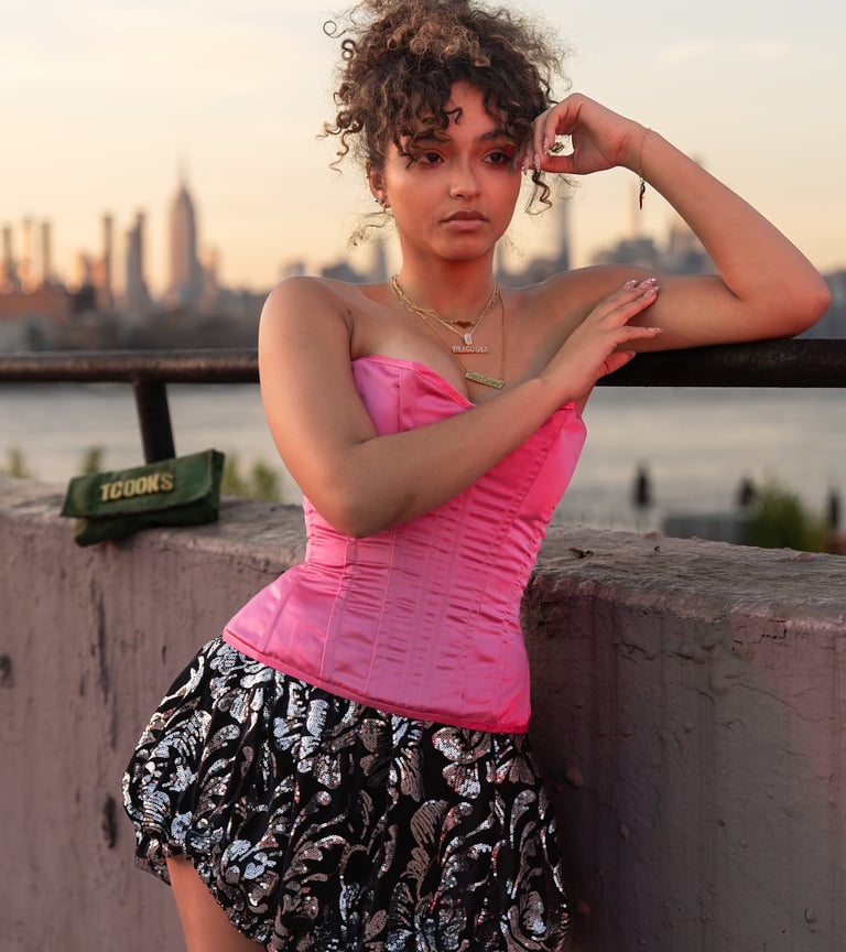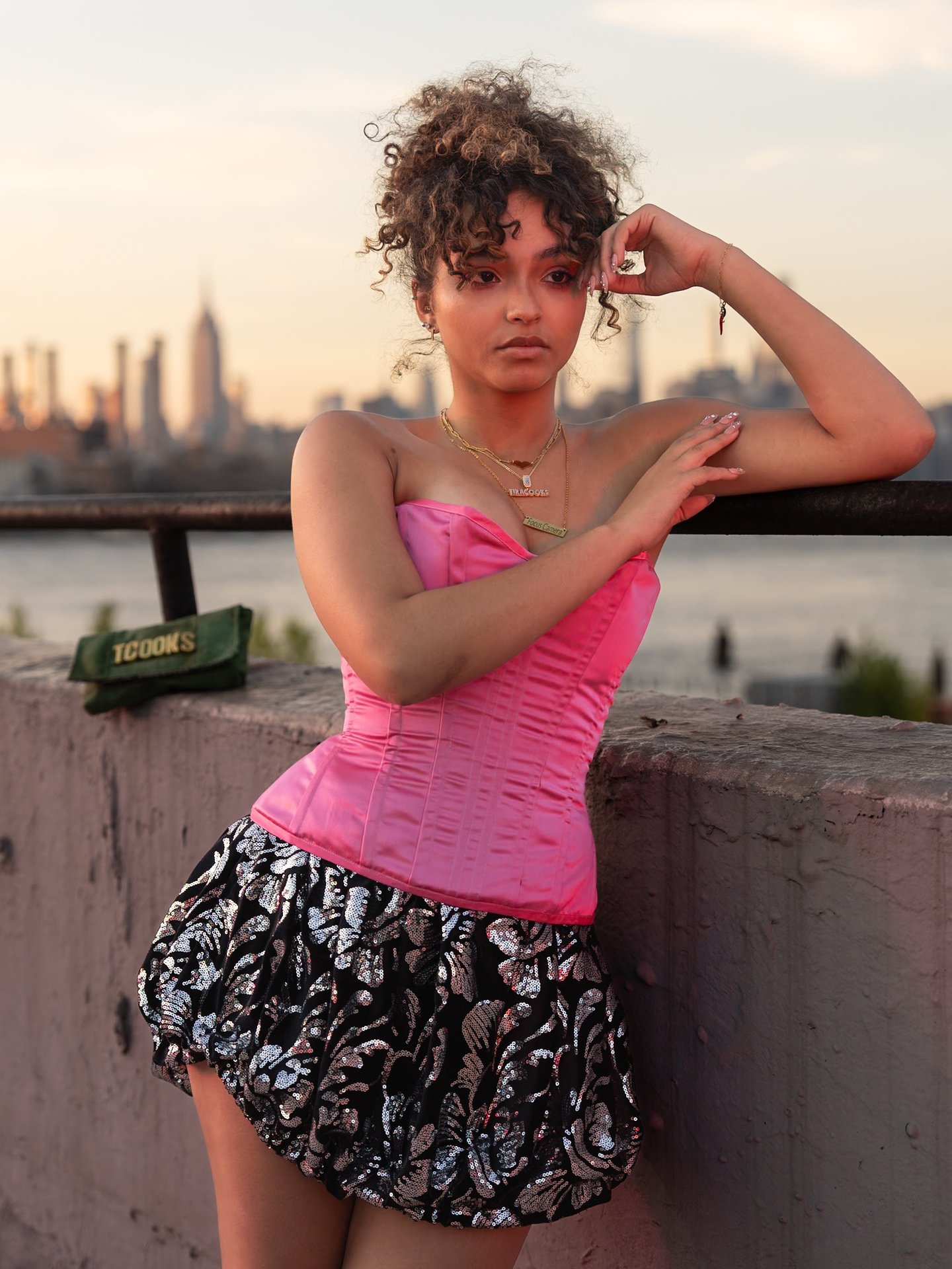 What do you wear to see a New York City sunset? A silk taffeta overbust corset, obviously. Paired with a matching mini bubble skirt made from embroidered black stretch velvet fabric, and topped off with the WOLF clutch—dyed green calfskin with gold-plated letters spelling TCOOKS. Because your accessories should travel with you everywhere, waiting for their chance to shine.