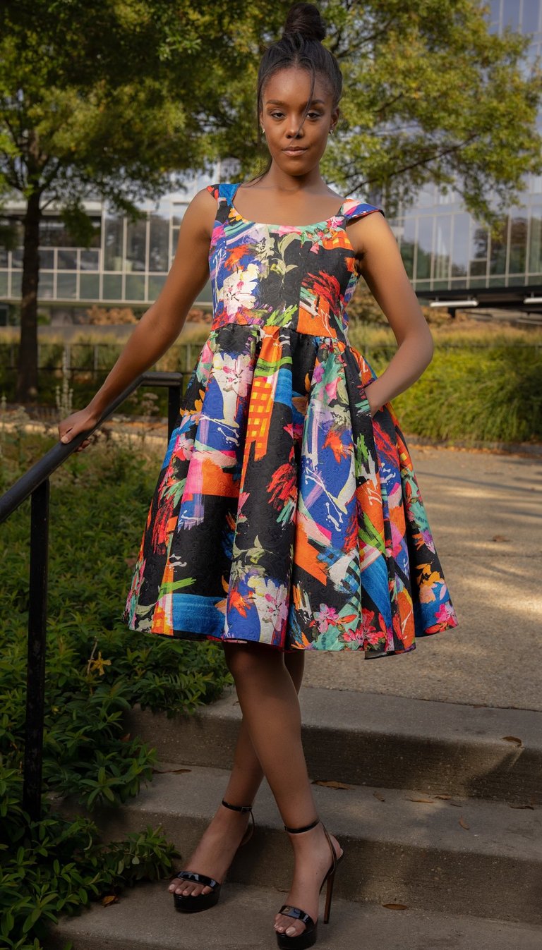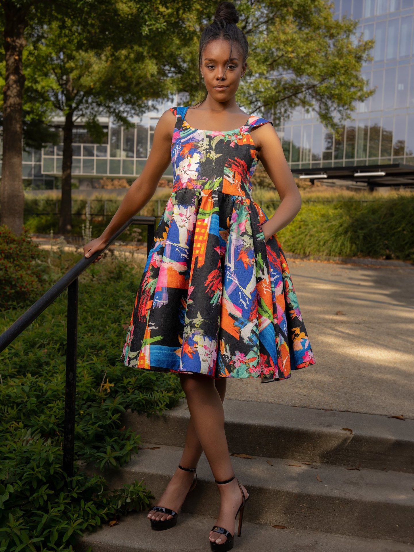 A 1950s-inspired dress—fit and flare with a full circle skirt made from that abstract pattern print from Canada. Timeless silhouette, bold fabric. The kind of dress that makes the sidewalk your runway.