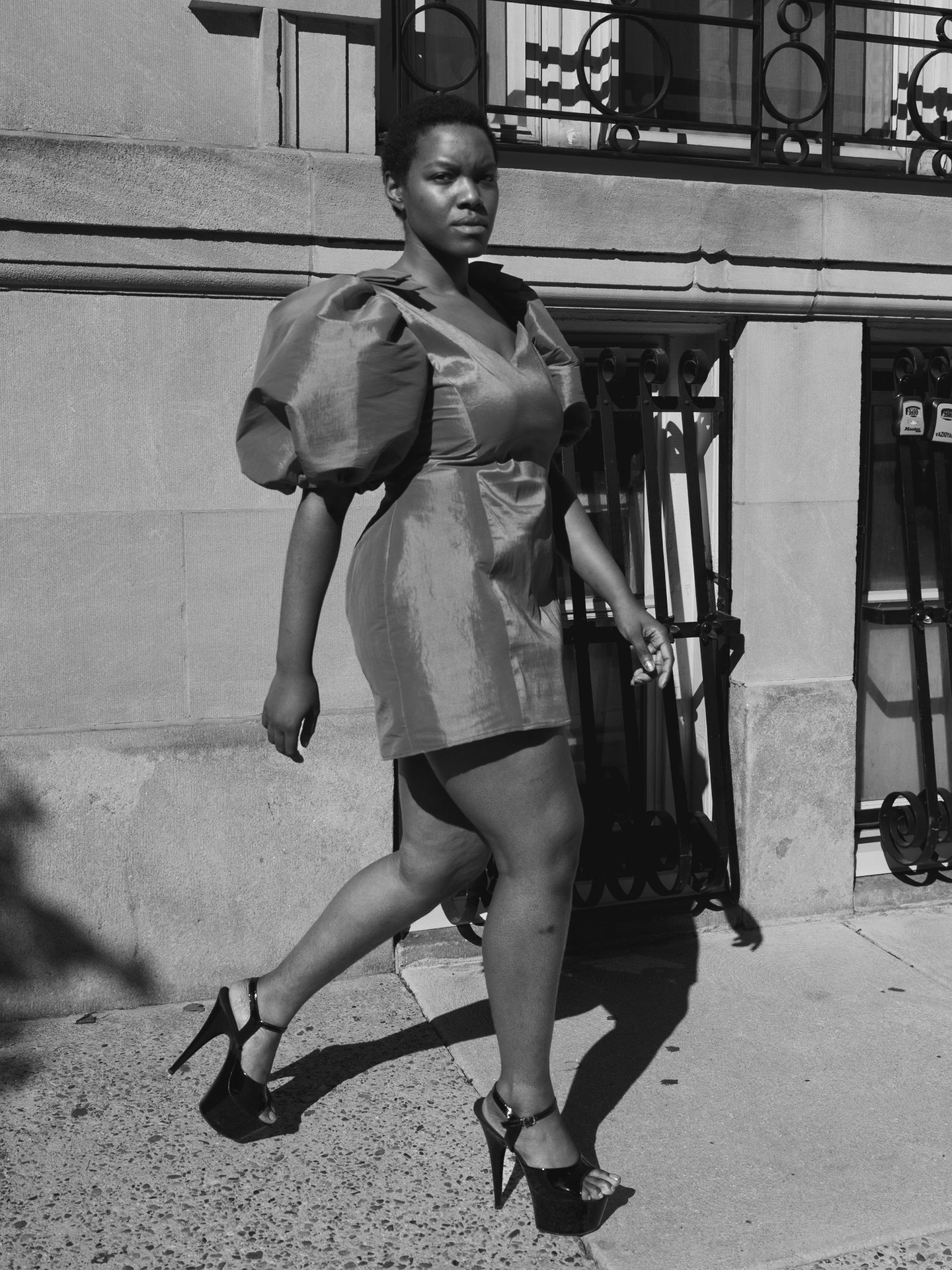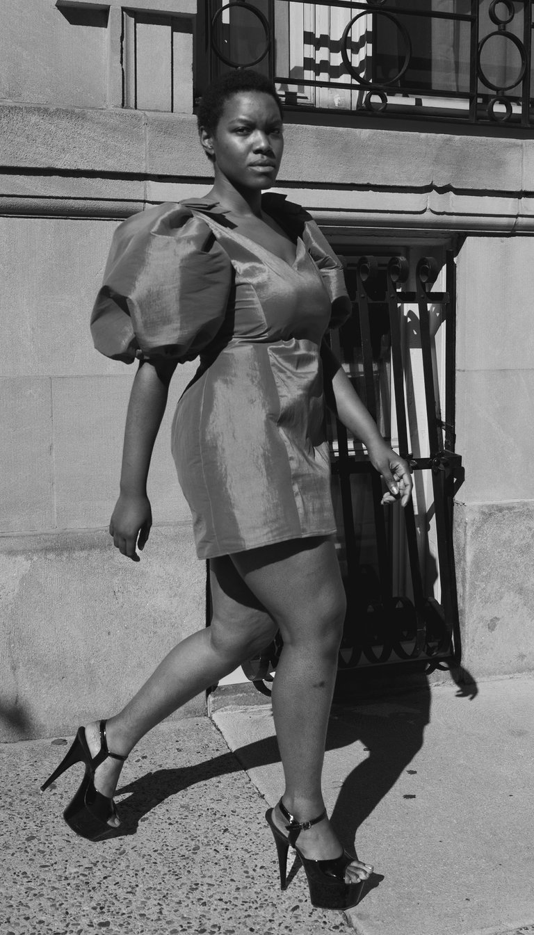 A black and white photo of me in 7-inch heels (because yes, they absolutely travel everywhere with me) wearing a dramatic puff sleeve midi dress with small bows at the top of the shoulders. This photo is about confidence, about owning who you are and what you create.
