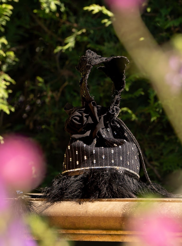 A revamped version of a Potli bag—a traditional Indian bag with a top handle and drawstring closure. Often used as accessories for weddings and festivals, these small pouches are characterized by their cinched top, decorative embroidery, and feather trimmings. Taking tradition and making it TIRACOOKS.