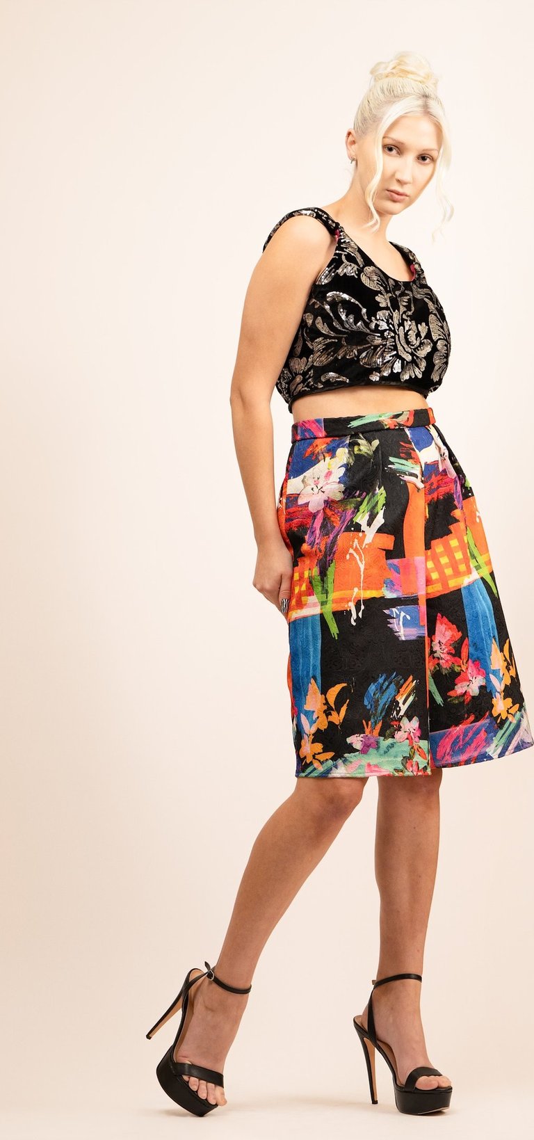 A classic crop top and high-waisted shorts. The 1950s-inspired crop top is made from embroidered stretch velvet fabric with black satin trimmings. The high-waisted shorts feature an abstract pattern print from Canada. Retro-chic with a TIRACOOKS twist.