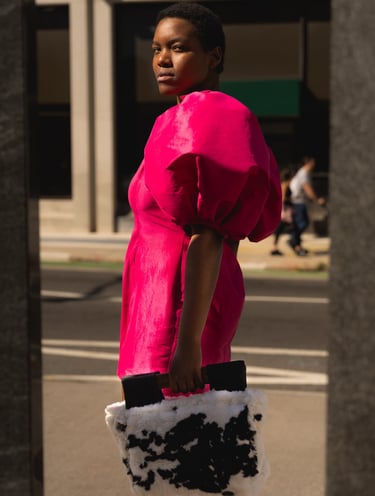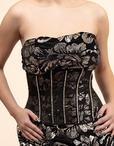 Curator-approved pieces for the woman who commands every room. Our bestselling collection merges corsetry with couture accessories—each handcrafted in the USA. The Kelly Dress and Corset feature metallic floral embroidery and body-contouring silhouettes, while the crystal-adorned Denise Purse adds art-gallery elegance.